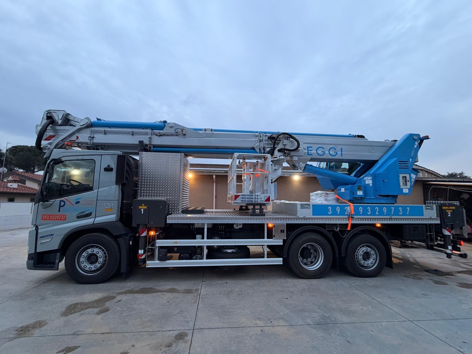 Piattaforma aerea telescopica allestita su autocarro da 26 tonnellate con altezza massima di lavoro di 45 m.