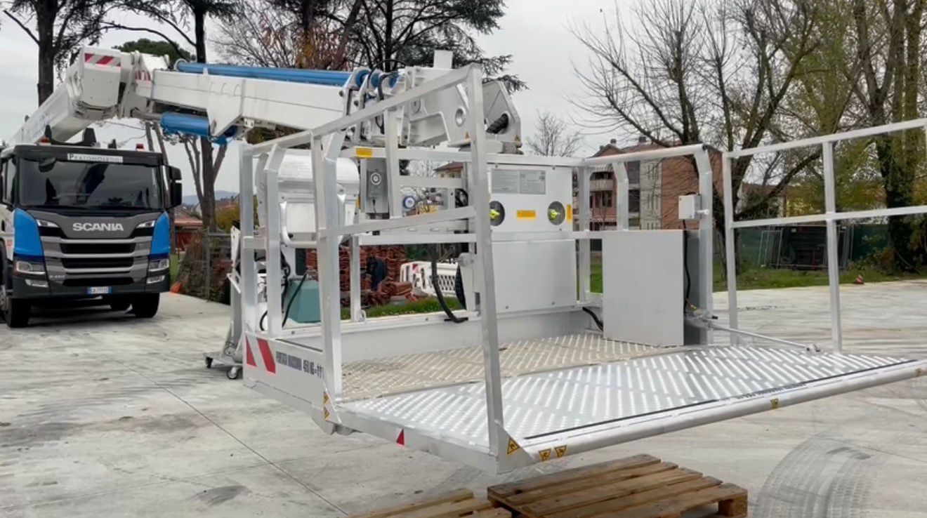 Trattasi di una piattaforma aerea mobile 52 metri capace di operare fino ad altezza massima mediante un piazzamento di soli 5,10 metri e sbracciare lateralmente, sempre con il solito ingombro, fino a 37 metri nonché lavorare in negativo sotto ponte fino ad una profondità di 15 metri. Questo mezzo speciale ha la possibilità di essere utilizzata come una classica PLE o come GRU. La cesta ha una portata di 500 kg. con una larghezza di 0,90, altezza di 1,10 e lunghezza in estensione fino a 3,80 metri; mentre la modalità GRU viene raggiunta attraverso un verricello, unico nel suo genere, avente portata di 1500 kg. Le due modalità PLE e GRU possono essere previste ed utilizzate lo stesso giorno in cantiere tramite un’operazione molto veloce, effettuata dai nostri operatori, di interscambio degli elementi strutturali (cesta e verricello) dando così un servizio completo e dinamico per il cantiere. Per ultimo, non certamente meno importante, possibilità di una cesta aggiuntiva con parapetto certificato ribaltabile verso l’esterno, capace di raccogliere pannelli in amianto, macerie, materiale vario fino a portate quindi di 500 kg. e consentendo all'operatore di scendere dalla cesta essendo certificata per lo sbarco in quota. Una piattaforma unica nel suo genere con caratteristiche funzionali che fanno certamente la differenza.